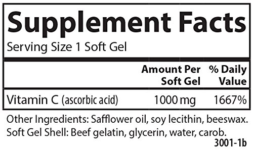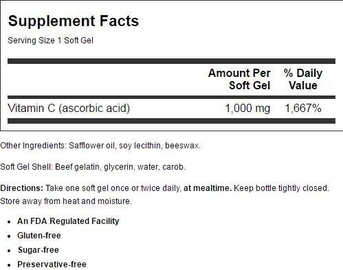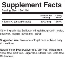 Suggested Use As a dietary supplement take one soft gel once or twice daily at mealtime - Or as directed by your healthcare professional. Supplement FactsServing Size: 1 SoftgelServings Per Container: 100Amount Per Serving% Daily Value***Vitamin C (ascorbic acid)1000 mg1667% ***Percent Daily Values are based on a 2,000 calorie diet