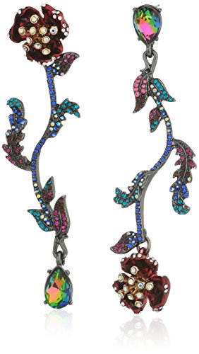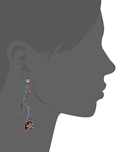 gold and hematite tone mismatch floral drop earrings with blue and pink tonal stones and a burgandy flower with crystal stones