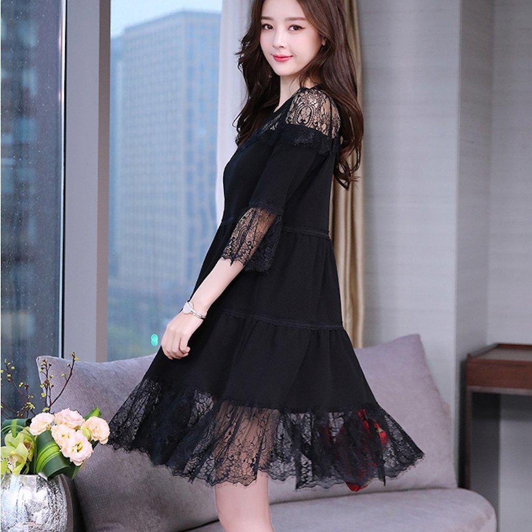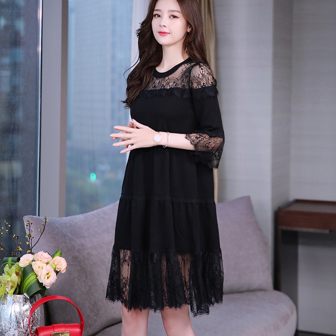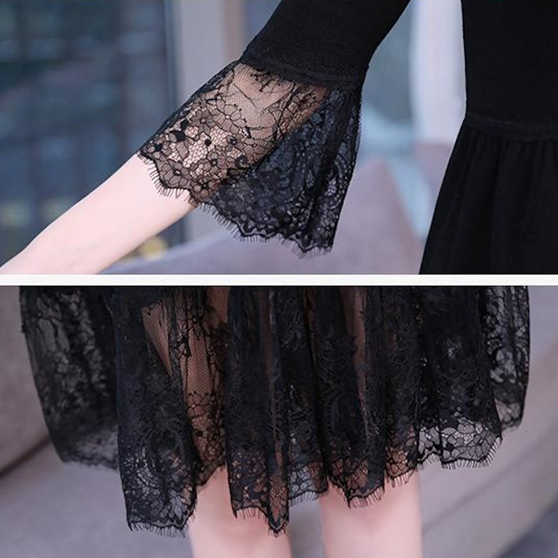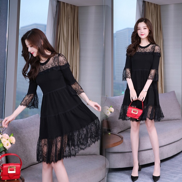 レース装飾で程よい透け感の大人可愛いワンピースドレス。