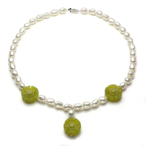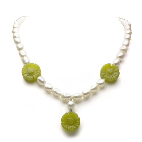This is a Classic but Ellegant Sterling Silver 8-8.5mm White Baroque Freshwater Cultured Pearl and 20mm Flower Shape Simulated Olive Serpentin Necklace 18". Please Contact Us If You Do Not See What You Need.