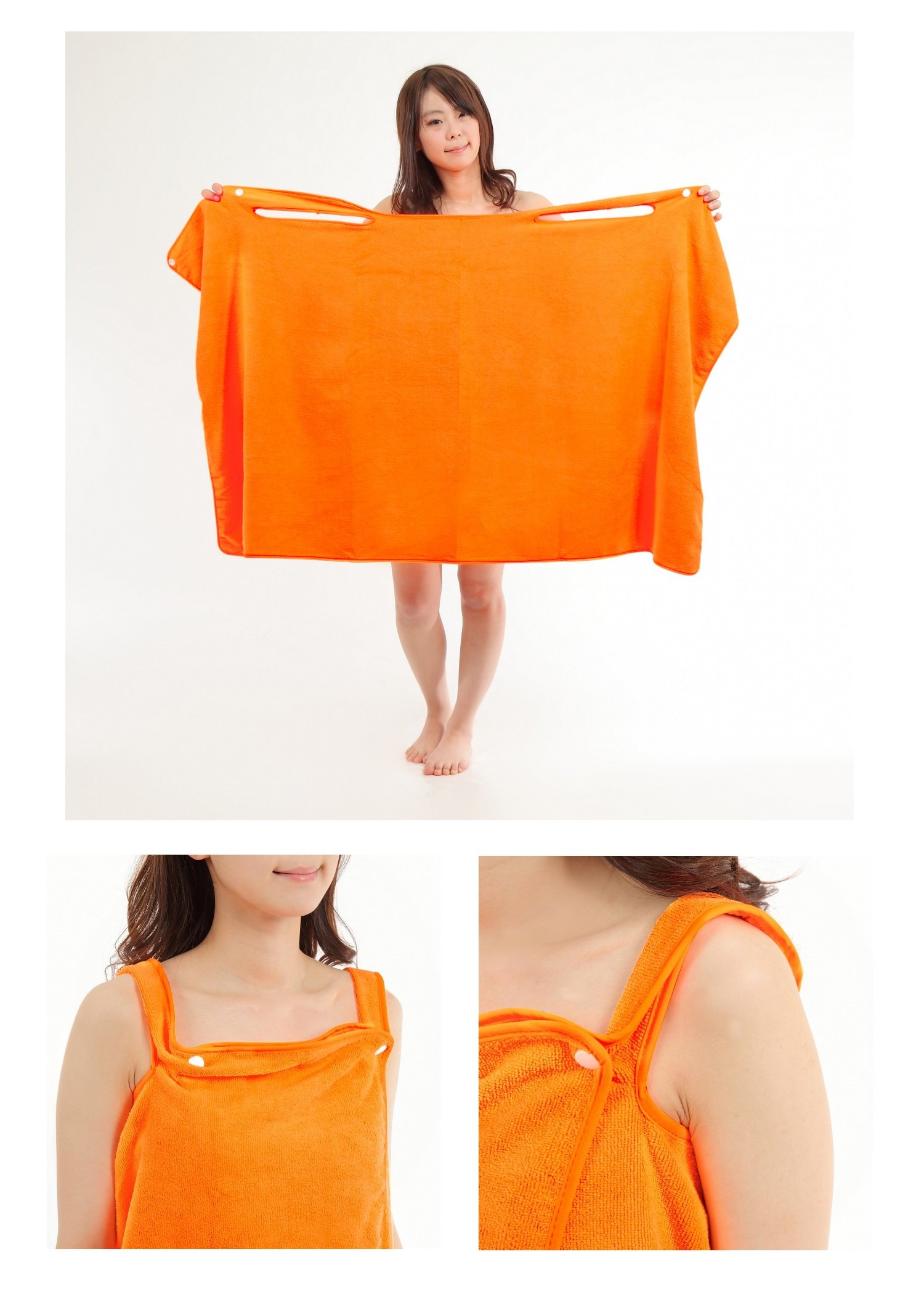 It is a body towel that you can wear, wearing a bath towel from the shoulder and stopping with a button.
