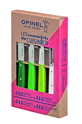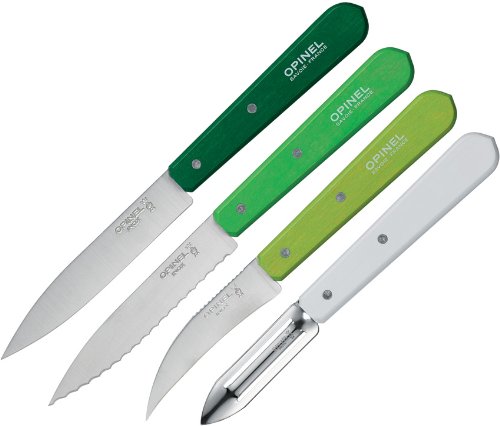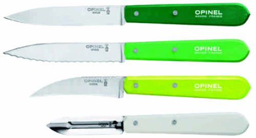 Studio : Opinel Knives Publisher : Opinel Knives Binding : Kitchen Product Description Opinel Knives - Opinel Four Piece Kitchen Set Dark Green Handle. Model: OP01709. Knives have stainless blade and wood handle. Includes white handle 2 1/2" peeler, light green handle 3" vegetable knife, medium green handle 4" serrated utility knife, and dark green handle 4" paring knife. Ideal for a variety of kitchen tasks including: chopping, peeling, slicing, paring fruit and vegetables, and trimming meat. 0