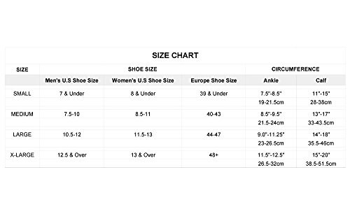 - Feature : GRADUATED MEDICAL-GRADE COMPRESSION - Black socks: 30-40mmHg ; Pink socks: 20-30mmHg enhances circulation and oxygen delivery to muscles for increased athletic performance, decreased soreness, and faster recovery. / HIGH QUALITY CONSTRUCTION - Custom design by an ER doctor and endurance racer integrates a contoured ribbed body, ankle wrap, padded heel and forefoot, cross-woven arch for improved leg, calf, ankle, foot, and lateral support. / PERFORM BETTER - Ideal for sports and exercise: running, cycling, basketball, yoga, ski, hiking, softball, crossfit, hockey, baseball, walking, volleyball, golf, snowboarding as well as reducing swelling and fatigue during flight travel, maternity, and long periods on your feet at work. / RECOVER FASTER - Scientifically proven to decrease lactic acid as well as aid in recovery and prevention of shin splints, calf cramps, Achilles tendon pain, varicose veins, DVT, edema, swollen feet and ankles. / COMFORTABLE FIT - Non-binding cuff keeps the socks up without restricting blood flow and a roomy toe box allows free movement. Sizing based on men's shoe sizing: Small fits 7 and under. Medium fits 7.5-10. Large fits 10.5 to 12. X-Large fits 12 and over. (If you have larger calves, consider ordering a size larger)