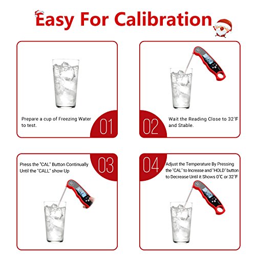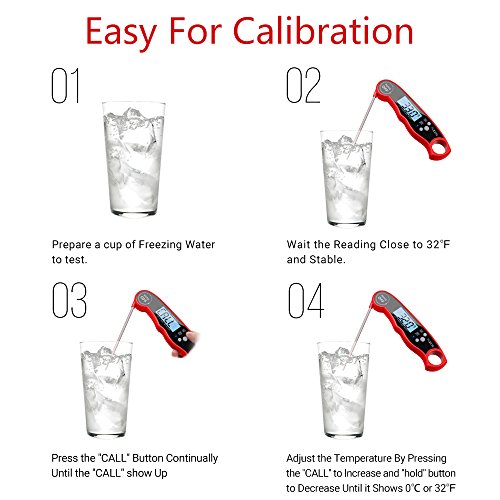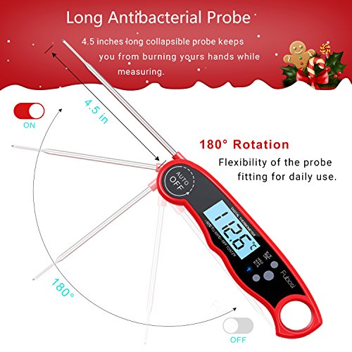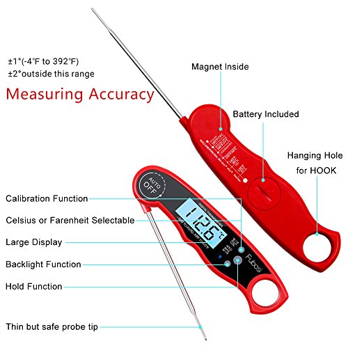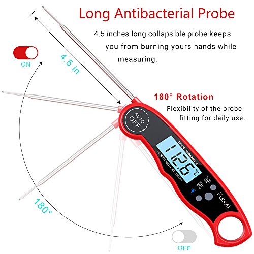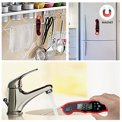 Features: ?Waterproof design ?Super fast response time of 2-3 seconds ?°F/°C?Switchable ?Calibration ?Large LCD readout ?Accuracy of /-1 degree ?Magnetic?Refrigerator?Attachment ?Bright backlight, convenient for darkness environment ?Hold function to record data ?4.5 inches long collapsible Antibacterial probe keep your hand away from hot source, fit for cooking, BBQ, grilling ?Auto On/Off when probe unfolded/folded, auto shut off after 10 minutes if no operation ?Large hanging hole ?Strong magnet to attach ?Uses:BBQ,?Oven,?Smoker,?Meat,?Food, Milk,Candy, Turkey, Grill, Bathing(for baby)? Steaks,Fish, Chicken, Bread, Pastries, Side dishes