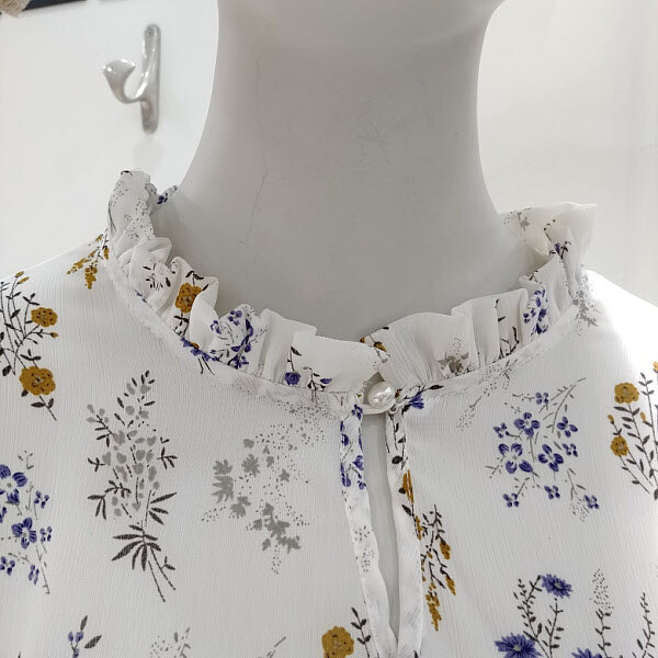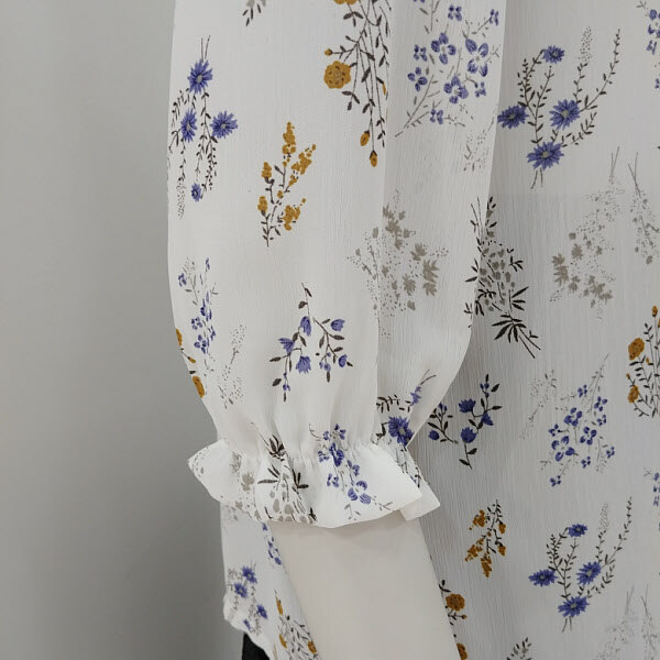 여름에 입기 좋은 하늘 하늘한 소재에 트렌드인플라워 나염을 찍어 디자인된 블라우스 입니다셔링 반넥 카라가 루즈하게 올라오며 슬랙스와코디하기 좋은 블라우스 입니다 소매는 7부 기장으로 나왔으며 단품으로 착장하여 포인트주기좋은 블라우스 입니다기장은24 인치 입니ㄷ