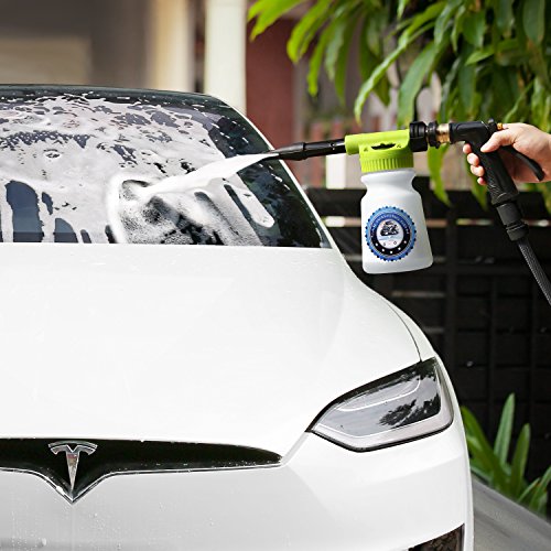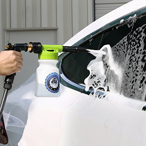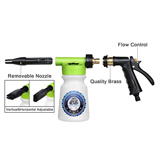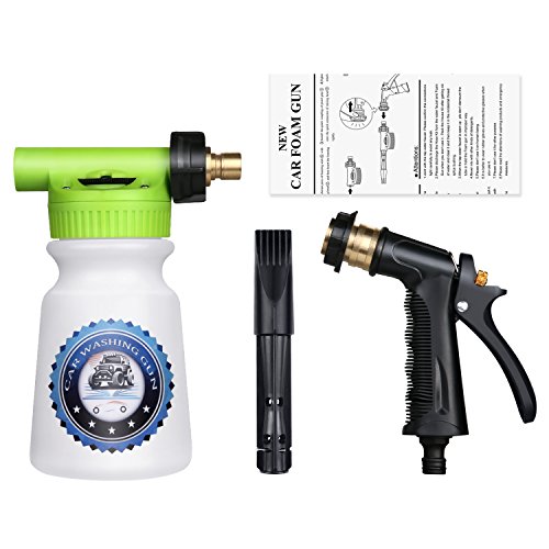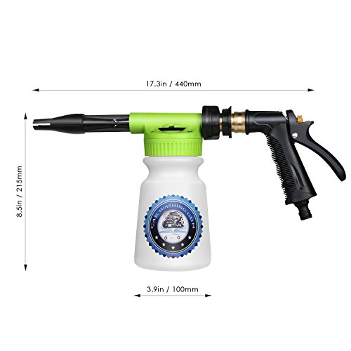 -. Feature : SAVE TIME & MONEY - Do you want to quickly wash your car with less time and money? It only takes 4 steps to meet your need. First, putting the lotion in the bottle and connecting with garden hose. Second, spraying foam on the car. Third, cleaning the car by sponge and flushing off the car. Finally, drying the car with towel. At last, you don't have to line up at a car wash, which save time and money a lot. / HIGH-QUALITY MATERIAL - The pipe joint is made of premium brass, fitting any standard garden hose, ensuring the water-tightness of wash gun. The perfect-fit rubber seal ensures a leak-free connection to the hose. Easily wash away the dust and dirt on the car with no more wet clothes. And the heavy duty ABS plastic parts provide the foam sprayer with superior durability. / FILLING LINES & ADJUSTABLE FOAM SPRAY - The foam gun has a 0-5 gear adjustment dial. The concentration of foam can increase as the number increase. What's more, refined internal components allow better interaction of water and air, mixing more air with the detergent in the bottle. Less detergent more foam. You can also fill in soap and water based on bottle filling lines without guessing. / DISMOUNTABLE & PORTABLE & SPACE-SAVING - This wash gun is dismountable, enables you to dismount to store when not in use. And the size of wash gun is 3.9 x 8.5 x 17.3 inches, it weighs only 1.4 pounds, which is small in size and light in weight. Therefore, it will save space, is portable and convenient for you to take to different places. / MORE FUNCTIONS - This foam sprayer has many functions which meets your different needs. On the one hand, it can be used as a watering can to water your flowers and grass. On the other hand, it can be used as a wash gun to wash your car, bicycle, motorbike, yard ground, swimming pool, beach chair, glass, wall, etc.