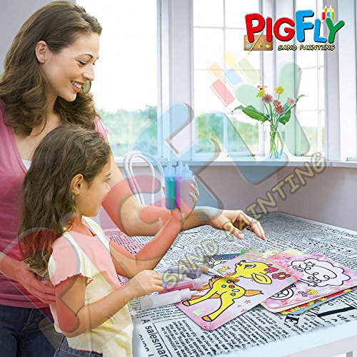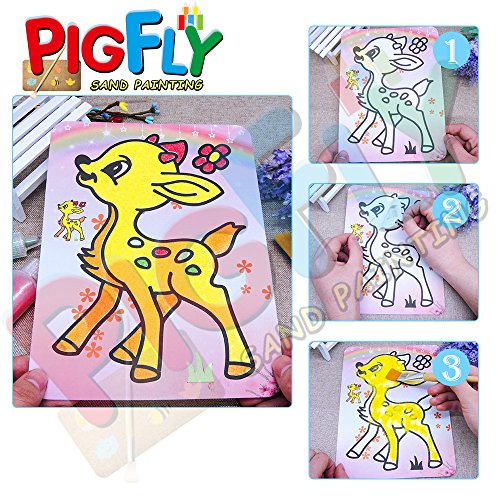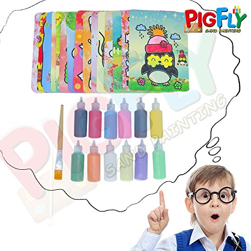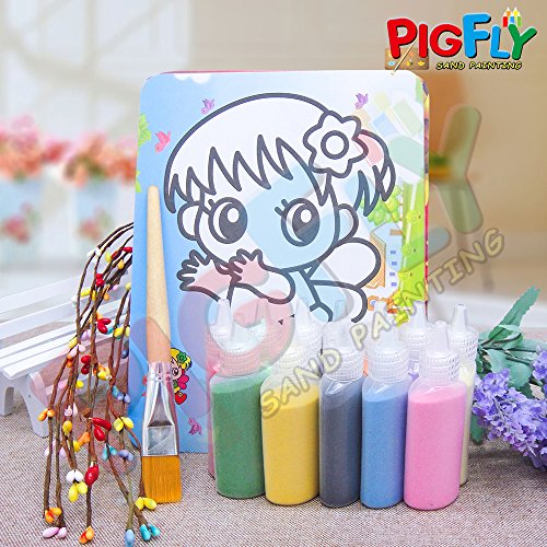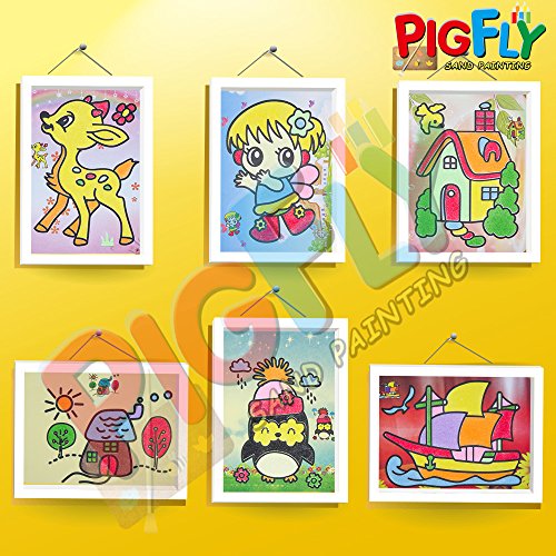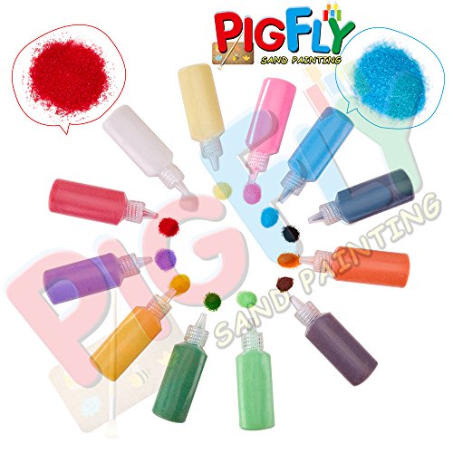 Studio : Pigflytech.Inc Publisher : Pigflytech.Inc Binding : Toy Product Description The kit includes 12 colors of sand in individual containers, stickers to mark the sand containers, a pealing tool, 4 activity pieces and an instruction booklet. The theme is colorful birds. The variety of colors make the activity pieces really colorful and beautiful. Bright colors with earth tones give them a nice balance of colors. The kits are designed to be done in their boxes. Each box has a small hole in a corner for excess sand to be funneled back into the containers. The process is easy to do to get consistently good results. Place the desired activity piece in the box. Use the pealing tool to peal off the first location for the sand. Take the colored sand for that location and gently tap enough to cover the location on the activity piece. Tilt and tap the box to move excess sand to the bottom of the box. Position the sand container for that color near the hole and tap the sand to the hole and into the container. 0