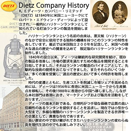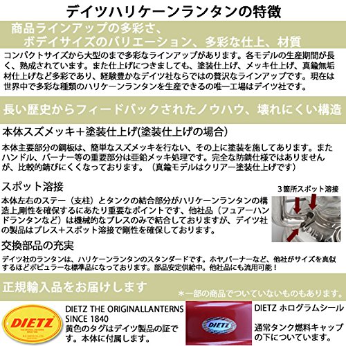 R.E.DIETZ사제의 오리지날 랜턴입니다.동사는 미국 뉴욕에 있어서 1840년에 창업하고, 현재는 국외 공장 둬 랜턴을 생산을 하고 있습니다. 비교적 컴팩트한 몸에 밝은 5 분심의 편성으로,장시간 연소,사용하기 쉽은 GOOD밸런스인 랜턴입니다. 또한 멋진 흑색 도장 파트가 클래식한 분위기를 빚어 내밀기 있습니다. 바디의 강성도 충분하고,소형이면서 의지가 있이 있습니다. 또한 연료 캡의 안쪽에는 고무 패킹이 누름입 되어 패킹 분실 우려도 없습니다. 멍게에 관해서는 수작업 를 위해 조금의(상처,기포,분산)서는 있지만,유리의 두께는 충분히 확보 되고 나와 튼튼합니다. 도장에 관해서도,충분히 강도가 있어 경질인 느낌으로”얼룩,벗겨지다”적게 마무리되도 더할나위 없이 좋습니다. 심은 15mm(5 분심)나와 밝기는 8w정도의 전구 같은 수준입니다고,밝은 램프가 되어 있습니다.