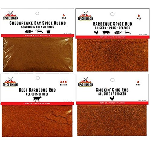 -. Feature : Chesapeake Bay Spice Blend: Specially blended to enhance the flavor of fish, seafood and French fries - Outstanding on Crab, mixed into Crab Cakes or seasoning for Seafood Chowders and stews / Barbeque Spice Rub: The Barbeque Spice Rub is a robust blend of spices that will give you a burst of flavor in every bite - not too hot, not too sweet; you'll be eager for the next bite / Beef Barbeque Rub: The Beef Barbeque Rub enhances and balances the rich flavors and fats found in the best cuts of Beef - A salty start, rich beef flavor in the middle and clean finish of spice blend / Smoking' Chic Rub: A smooth blend of herbs and spices - You'll end up with a nice crust on your bird and a sweet, smoky flavor / Spice Union spice blends are hand crafted in small batches-all natural-no MSG, fillers, anti-caking agents, nitrates or other preservatives-Simply herbs and spices in each Spice Union premium blend