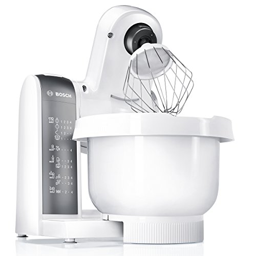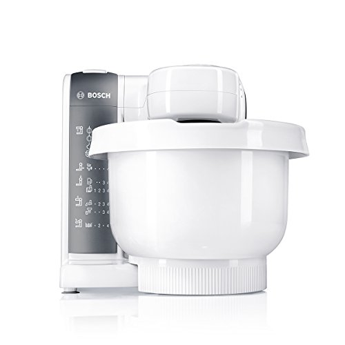 -. Feature : Praktischer Alleskönner mit großer Rührschüssel (3,9l, max. Teigmenge 2,0 kg) / Vielseitig einsetzbar mit Patisserie-Set (Schlagbesen, Rührbesen, Knethaken) und nützlichem Durchlaufschnitzler mit 4 Scheiben zum Raspeln, Reiben, Schneiden und für Klöße/Reibekuchen. / Dynamisches 3-D Rührsystem MultiMotion Drive für optimales Vermengen der Zutaten. / Individuell erweiterbar mit einer Vielzahl an hochwertigem Zubehör sofern noch nicht im Lieferumfang enthalten z.B. Eisbereiter, Getreidemühle, Multimixer, Spritzgebäckvorsatz, Fleischwolf, Mixer, u.v.m. / Einfach und sicher zu bedienen (Bosch Technik); leicht zu reinigen (Spülmaschinen geeignetes Zubehör) / Lieferumfang: Mixeraufsatz, Raspelwendescheibe, Reibscheibe mittelfein, Rühr-/Schlagbesen, Schneid-Raspel-Wendescheibe, Schneidwendescheibe, Deckel, Durchlaufschnitzler, Rührschüssel Kunststoff, Knethaken Metall, Rezept-DVD