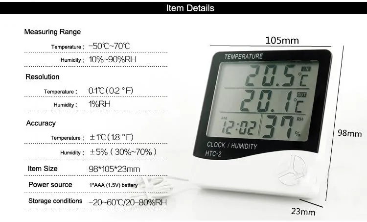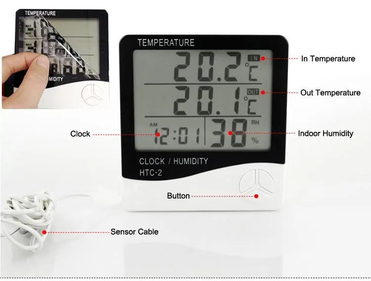 HTC-2 Indoor Room Digital Thermometer Hygrometer Electronic Humidity Temperature Meter Clock with External Outdoor Probe Sensor
