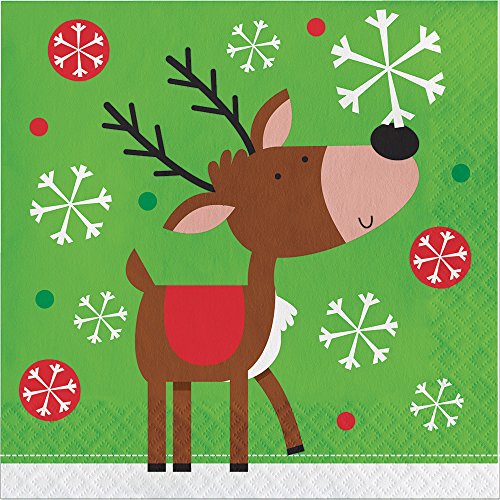 - Green napkin with wintery scene featuring a sweet-faced reindeer and snowflakes
