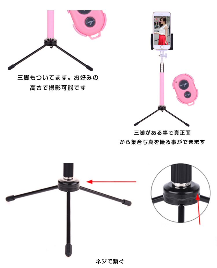 | 1分でできる簡単設定!機械が苦手な方でも簡単に設定できます!角度調整も自由自在!お好みのアングルで写真を撮る事ができます。リモコンで自由自在!bluetoothシャッターリモコン付属だからセルフタイマーやケーブルは不要。コンパクトで持ち運びもラクラク!三脚もついてます。お好みの高さで撮影可能です。三脚がある事で真正面から集合写真を撮る事ができます。 | |