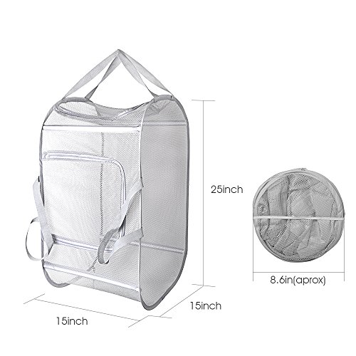 Mesh Pop-Up Laundry Hamper, Daly Kate Foldable Laundry Basket Large Mesh Hamper with Double Opennings and Reinforced Handles for Dirty Clothes-15x25"(Grey)