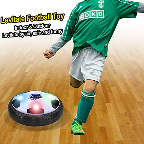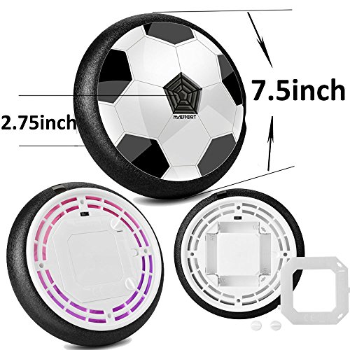 Maeffort Kids Air Power Hover Ball-- A creative new way to play soccer and air hockey all in one game! you can also give it as a girl or boy gifts. Have an amazing time in indoor games with young kids! Features: With the modest size of 7.5" which is similar to Size 4 soccer, a little bigger than other competitors. Neither too big nor too little. More suitable for multiplayer game. It is a nice toy for family playing together and multiplayer game. To cultivate child's interest, enhance child's curiosity, play it in big family to enhance the feelings between them. The Air Power Soccer is an amazing new disk that turns nearly any smooth surface into a sports court, inside or out. Use it on a low-pile carpet, hardwood floor, sidewalk or a driveway! As long as you have a flat surface, there's no end to the ways you can play. It has a powerful hover action that makes the Air Power Hover Ball literally float on a cushion of air. The hover ball's outer protective bumper safely protects furniture and walls while allowing for great rebounding! Specification: Recommended Age:6 - 15 years Color: Black White Material: Non-toxic plastic Battery: 4 * AA batteries (Not included) Package details: Product size:18.5*18.5*6.8cm color box size:19.5*7.5*19.5cm How it works: 1.Install 4 "AA" batteries on the bottom of the disk. 2.Flip the power switch, put it on a smooth surface and give it a little kick! You can kick it like a real soccer ball. Notice: Must be powered by 4 "AA" batteries (NOT INCLUDED). 0