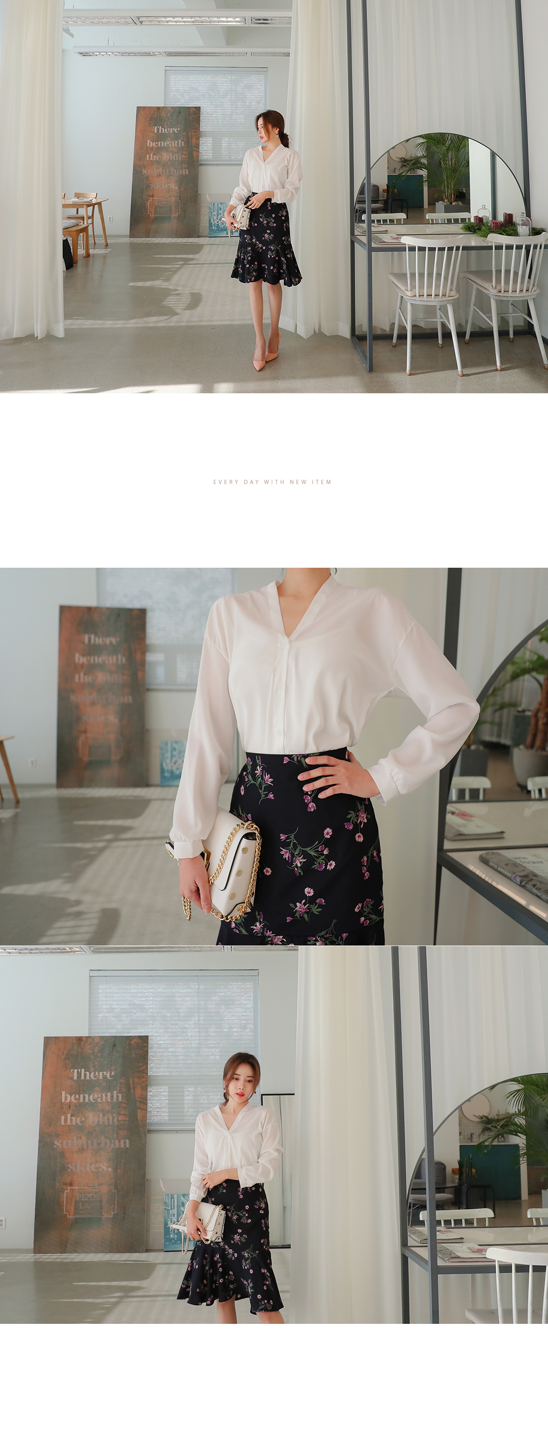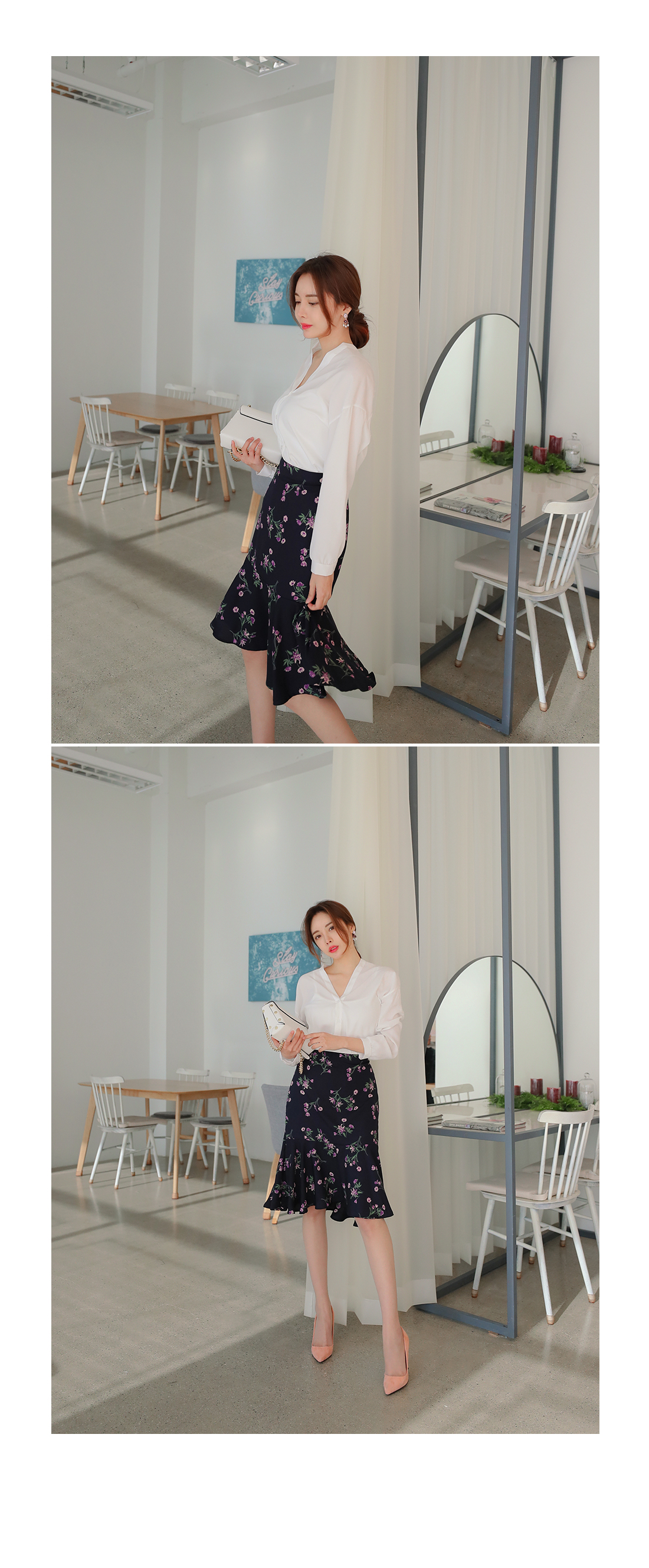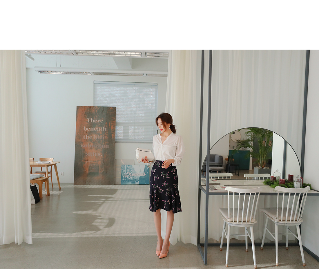 깔끔하게 떨어지는 브이 네크라인으로 쇄골라인이 돋보여