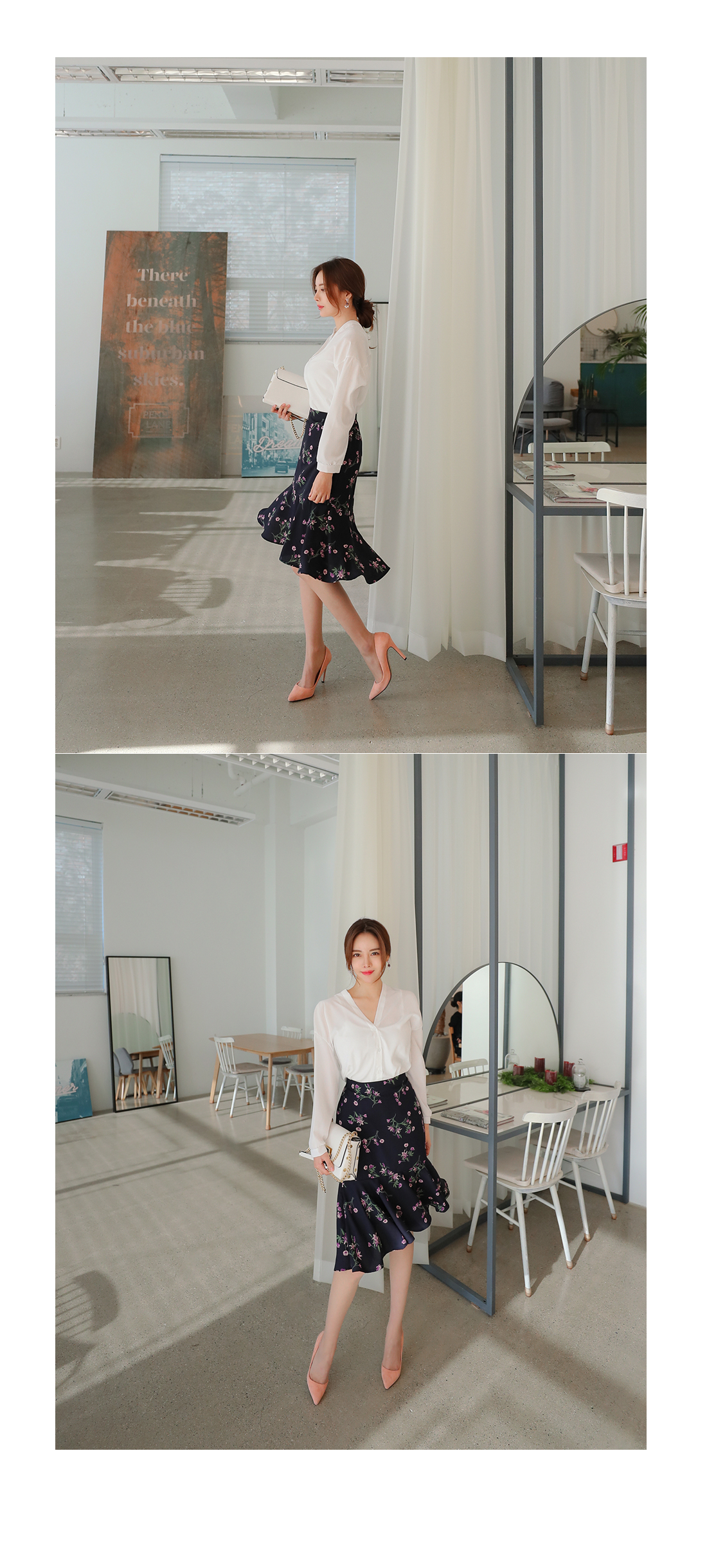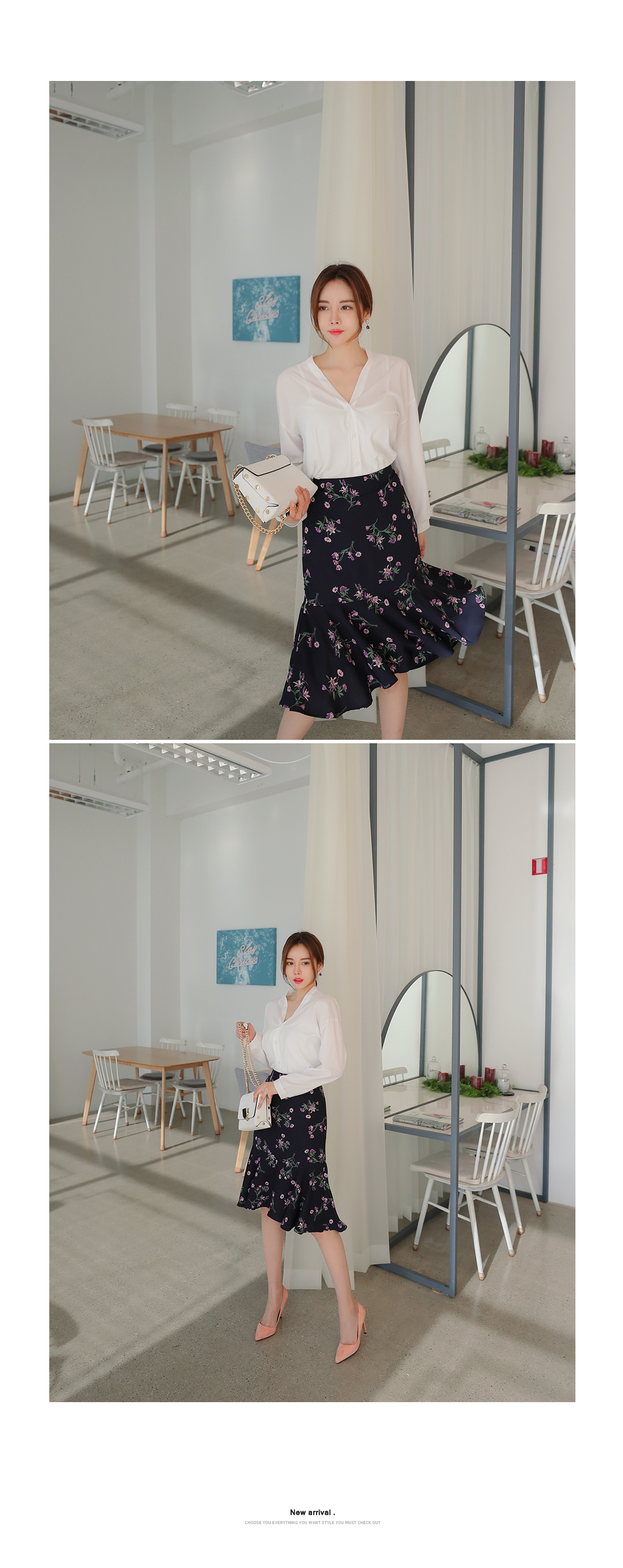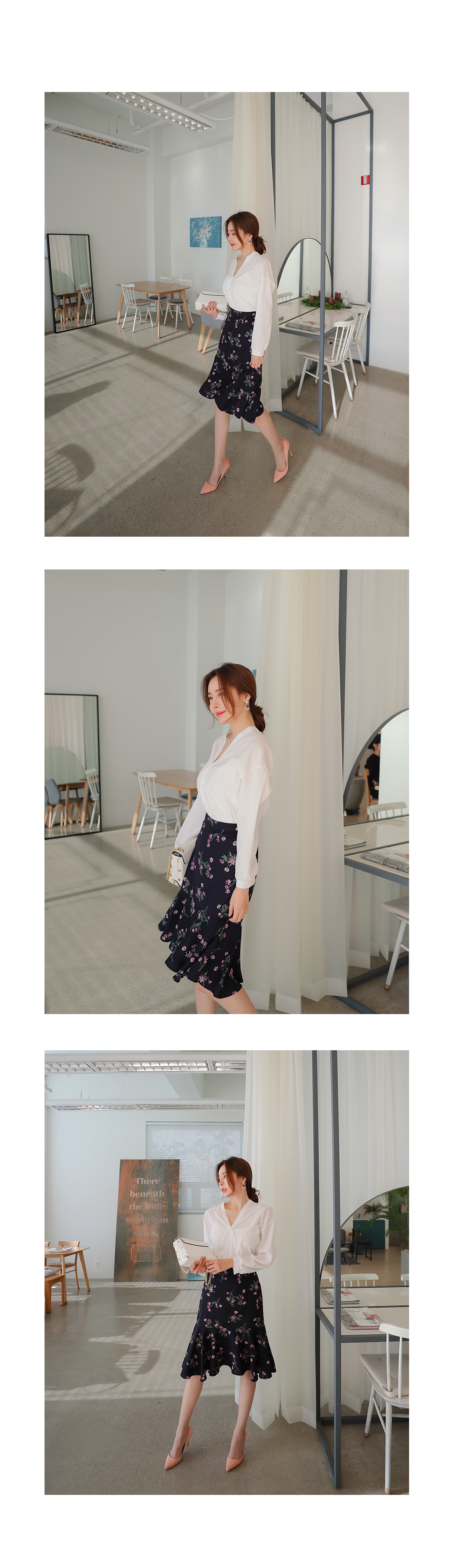 깔끔하게 떨어지는 브이 네크라인으로 쇄골라인이 돋보여