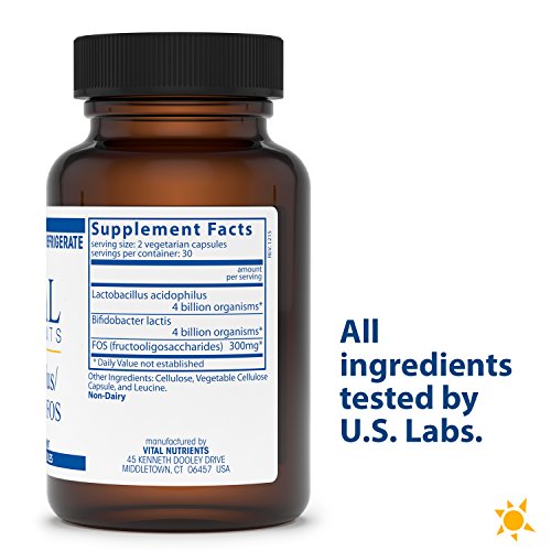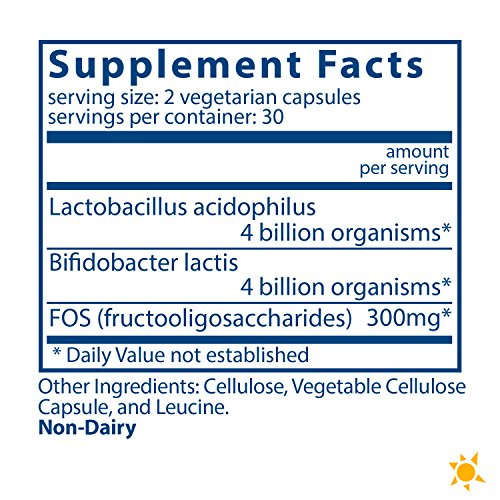 Acidophilus/Bifidobacter/FOS is a combination of two bacteria and FOS (fructooligosaccharides), a naturally occurring indigestible sugar that maintains the growth of normal gut flora. This product promotes healthy digestion, breakdown of food, a healthy environment in the intestines, and may also help maintain normal vaginal flora. This formula is dairy-free.Feature
