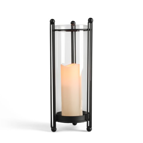 - Metal in a black powder coat finish and glass cylinder hurricane