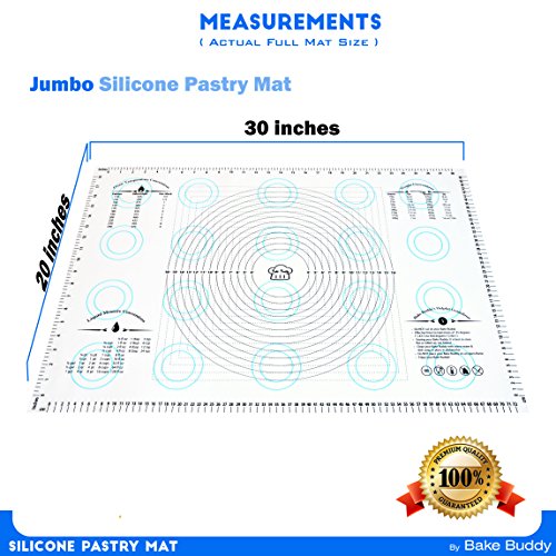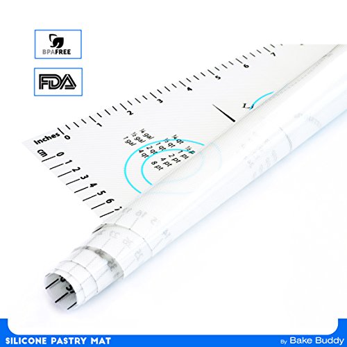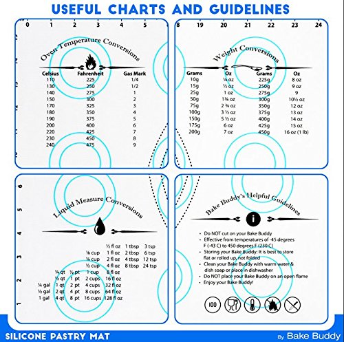 Bake Buddy Silicone Pastry Mat The Bake Buddy Silicone Pastry Mat provides an excellent non-stick baking surface that lies flat and grips to any flat surface. Protect your precious counter-tops, islands, and kitchen tables while maintaining a large professional and clean working area. Key Features ? Measuring 30 inches x 20 inches, .4 mm thick, the Bake Buddy is outlined with inch and centimeter ruled guides, displays 3 inch and 4 inch cookie circles, and includes 4 to 16-inch diameter guides perfect for rolling out pie crust, pizza dough, or fondant.4-16 Inch Square Guidelines Also Included. J ? Largely presented Oven Temperature, Liquid Measure, and Weight Conversion Charts, allow for easy recipe conversions and a list of helpful Bake Buddy guidelines also appear on the mat. ? Made of FDA certified, BPA free, high-quality food grade silicone, the Bake Buddy requires no parchment paper, cooking sprays, or oils and is effective from temperatures of -45 degrees F (-43 C) to 450 degrees F (230 C). ? Washes easily with warm water and soap. Can also be placed in the dishwasher. ? Makes and Excellent Gift for anyone who enjoys baking or is interested in starting! The Bake Buddy was designed by bakers for bakers and is backed by our 100% Satisfaction Guarantee! Hassle-FREE Returns About Bake Buddy Bake Buddy is a leading supplier of high quality products for baking needs in North America. We are headquartered in Ontario, Canada and our products are manufactured by Gold Suppliers delivering Maximum Quality Control and Product Inspections. We strive on quality, and more importantly Customer service. We are all about having FUN at Bake Buddy. Prep...Cook...Grill...Bake...Entertain! Act now and Click the ADD TO CART button at the top right of this page! Our Premium Silicone Pastry Mats are a Must Have for any Baking Enthusiast. Happy Baking! 0 |
