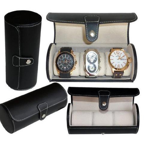 -. Title : IMIEE Black Leatherette Cylindric Watch Box, Jewelry Box Collection Storage, Holds 3 Watches/Bracelets