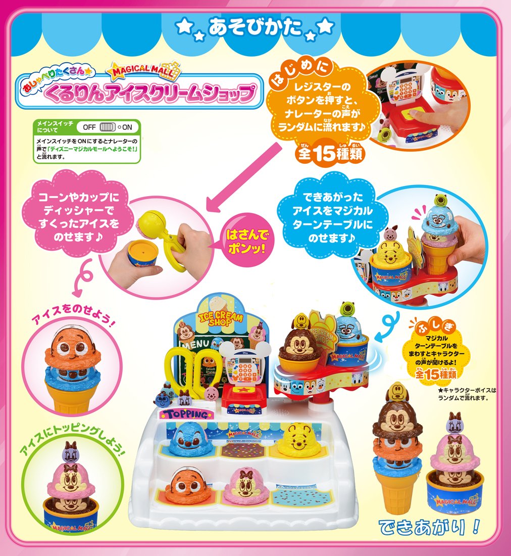 ディッシャーですくったアイスをカップやコーンにのせて、魔法のターンテーブルに乗せてまわすと、キャラクターのおしゃべりが聞こえます。