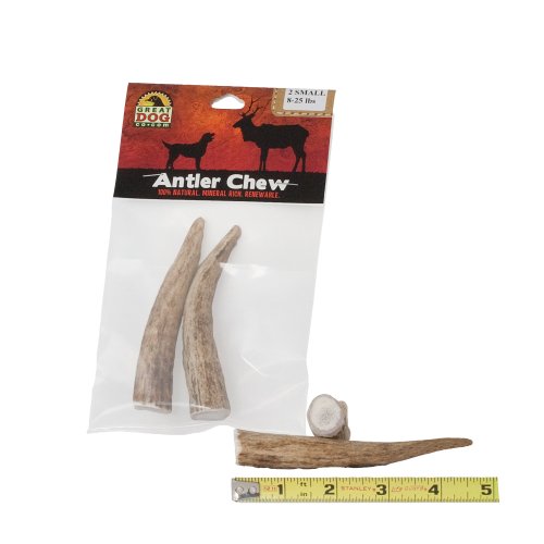 -. Feature : Great Dog Small Elk Antler Chews contain 2 Elk Antlers, each approximately 4.5-5" long, 2" in circumference and are best for dogs between 8-25 lbs. / Sourced from Colorado, Montana, Wyoming and Idaho, elk antlers are long lasting, even for the toughest, most aggressive chewers / Great Dog Elk Antler Chews provide 40 essential minerals, amino acids and other nutrients including calcium, zinc, manganese and potassium while helping to reduce the tartar build up on your pet's teeth / Elk Antler Chews are much less likely to chip or splinter than other types of bones when chewed / A renewable resource--antlers grow back every year and are naturally shed