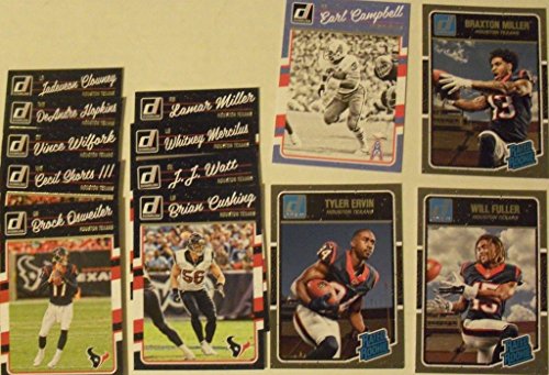 Houston Texans 2016 Donruss NFL Football factory sealed 13 card team set including Earl Campbell, Brock Osweiler, Cecil Shorts III, Vince Wilfork, DeAndre Hopkins, Jadeveon Clowney, Brian Cushing, J.J. Watt, Whitney Mercilus and Lamar Miller plus short printed Rated Rookies rookie cards of Braxton Miller #353, Tyler Ervin #398 and Will Fuller #400.