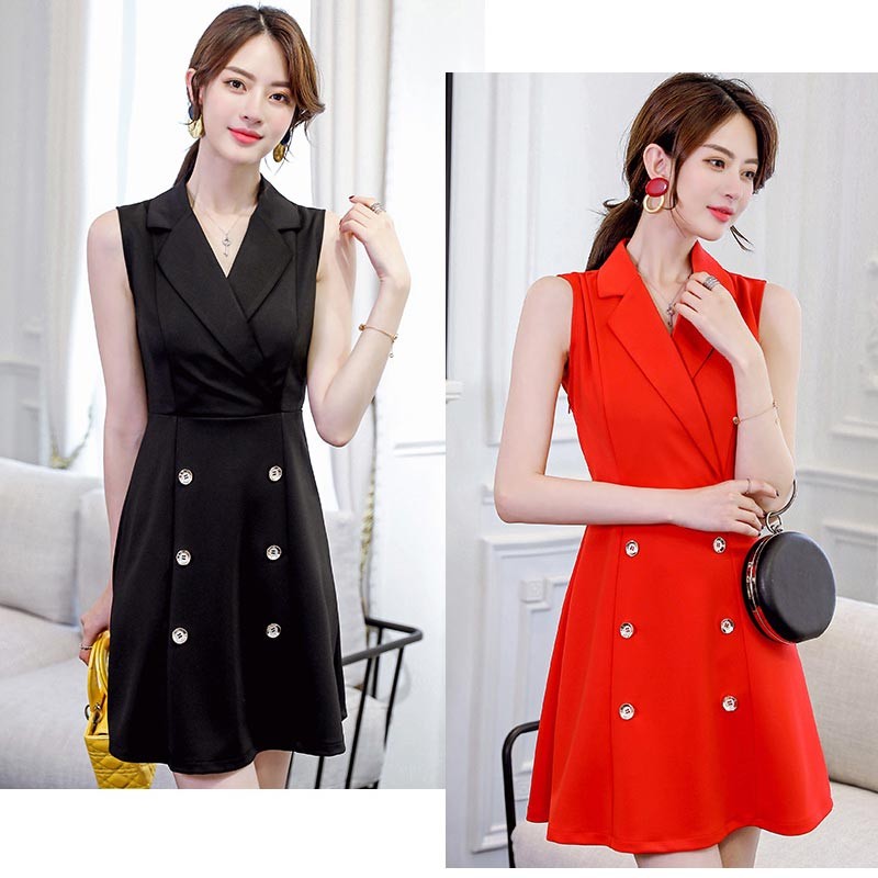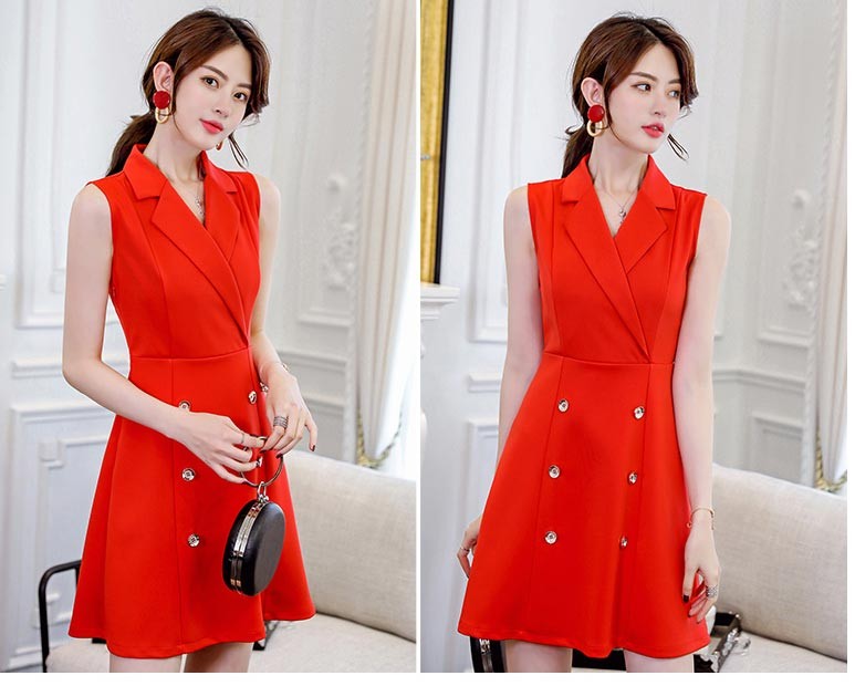 襟付きダブルボタンデザインでノースリーブ・ひざ上丈のワンピース♪