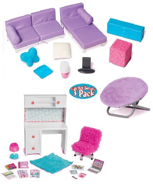 Studio : My Life As Publisher : My Life As Binding : Toy Product Description Create a great hangout space for your dolls with this living room set, desk and chair set and the saucer chair. The Living Room Set includes: 1 2-Piece Sofa Set, 1 Tray, 1 Pouf, 2 Throw Pillows, 1 TV Counter, 1 Mobile Phone Holder, 1 Table Lamp. The Desk and Chair Set includes: 1 plush mod chair, 1 lamp (lights up), 1 plush area rug, 1 laptop, 1 journal, 2 sticker sheets, 1 map, 1 calendar, 1 birthday card, 1 photostrip, 1 sleepover invite and 1 fashion magazine. The Saucer Chair has a sturdy metal frame with a soft faux-fur cover and folds flat for easy storage. 0