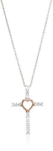 -. Title : Sterling Silver with Pink Gold Plating White Cubic Zirconia Heart Cross Pendant Necklace, 18"