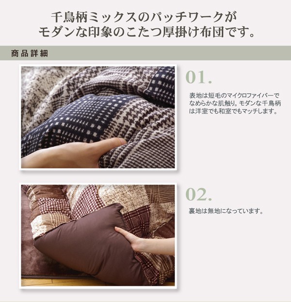千鳥柄ミックスのモダンなパッチワーク風こたつ布団です。繊細な柄をプリントすることで、まるで本物のパッチワーク生地のような仕上がりとなっております。カラーはモノトーンの深みのあるシックなカラーでまとめ、モード感のある大人の雰囲気仕上げております。表地には柔らかな肌触りの短毛のマイクロファイバー生地を使用しています。部分暖房のこたつは電気代もお得です。