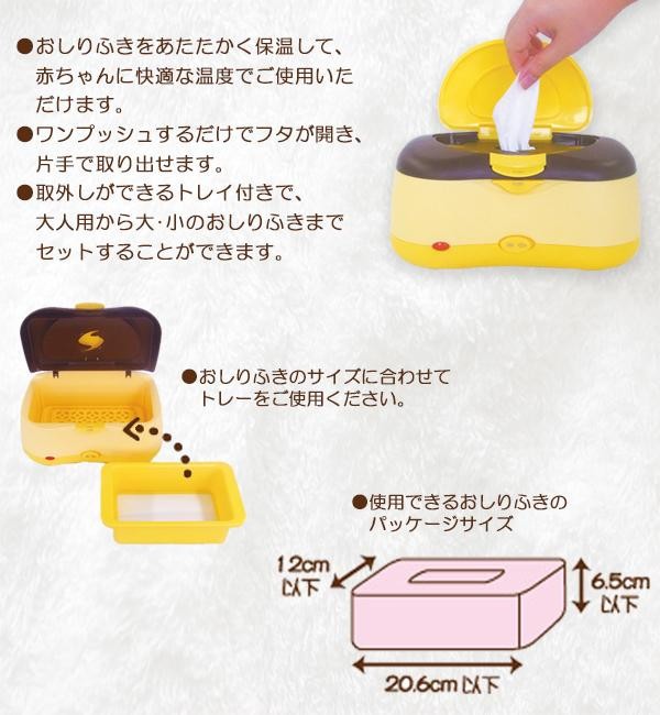| おしりふきをあたたかく保温して、赤ちゃんに快適な温度でご使用いただけます。ワンプッシュするだけでフタが開き、片手で取り出せます。取外しができるトレイ付きで、大人用から大・小のおしりふきまでセットすることができます。 |
