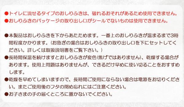 | 仕様 | 定格:AC100V・50/60Hz・13W コード長:約1.5m 使用できるおしりふきのパッケージサイズ:20.6×12×6.5cm以下 |
