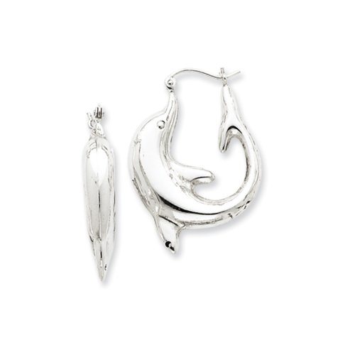 Flaunt your fun loving style with these carefree dolphin hoops made of rhodium plated sterling silver! They feature a bright, polished finish, a hollow 3-D design with a hinged post back.