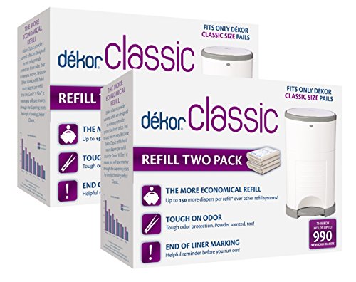 Each box contains 2 refills and holds up to 990 newborn diapers. Simply cut the refill with the kid-safe cutter located inside the access door, discard, and tie a new knot in the remaining bag. Each Dekor Refill is one long continuous liner with no preset perforations or size, which means you can empty as often as you want—whether it’s after one particularly stinky change, or when the pail is totally stuffed—and use only what you need. Emptying the pail is super-easy. Dekor Classic Refills are made of 20% recycled materials (a mixture of post-consumer and commercial) and infused with a pleasing baby-powder scent that helps neutralize odors.Feature