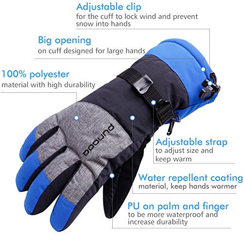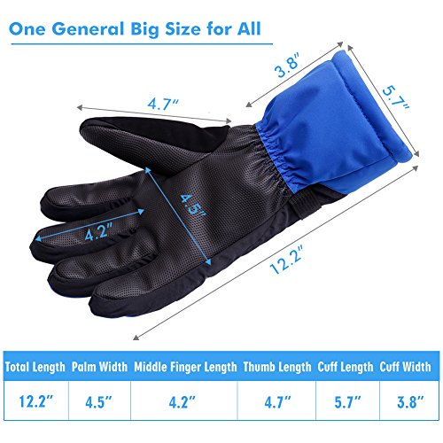 Outstanding Features of our Ski Gloves ■Top Warmth Best for Your Winter Activity-Our skiing gloves has the premium 3M thinsulate plus the inside the gloves to ensure great warmth when you are skiing or snowboarding. ■Highly Waterproof-The Ski Gloves not only are made of waterproof coating material, but also has a plastic inside the cotton to prevent the water substantially. ■User-friendly design to lock wind and Snow. Our ski gloves have an adjustable strap on the wrist and also a drawcord on cuff to keep snow out of skiing gloves. ■General large size to fit most people. Our winter skiing gloves has one size to fit a large number of people. The size is based on our research of hands of hundreds of men. The size is a little bigger than general hand to ensure flexibility when using it in outdoor activity.