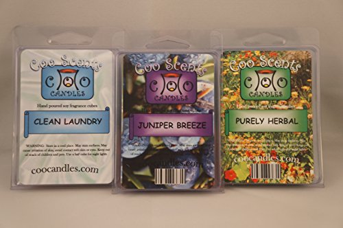 Wickless candles made with all natural soy and beeswax. One pack (6 cubes) of our Clean Laundry scent, one pack of our Purely Herbal scent (think clean hair), and one pack of our Juniper Breeze scent.