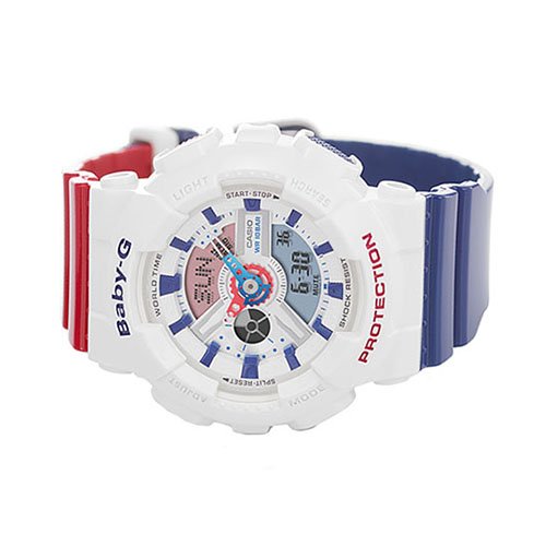 Electroluminescent back light provides clarity in any situation. World time:29 time zones (48 cities), city code display, daylight saving on/off. Four one-time alarms and 1 snooze alarm. Face features digital and analog display. 1/100 second stopwatch with a measuring capacity. 4 one-time alarms and 1 snooze alarm. Full automatic calendar. Countdown timer.Measuring unit: 1 Second.Measuring capacity: 24 Hours.Input range: 1 minute to 24 hours (1-minute increments and 1-hour increments). Module 5338. Large case design with 3-D protection case structure. Resin band and and metallic buckle closure. Water resistant up to 100 meters. Battery: SR726SW x 2. Approximate battery life: 2 years.