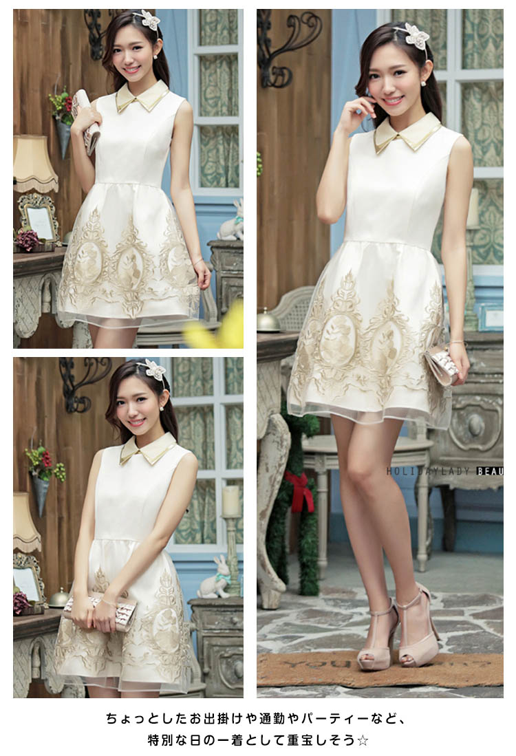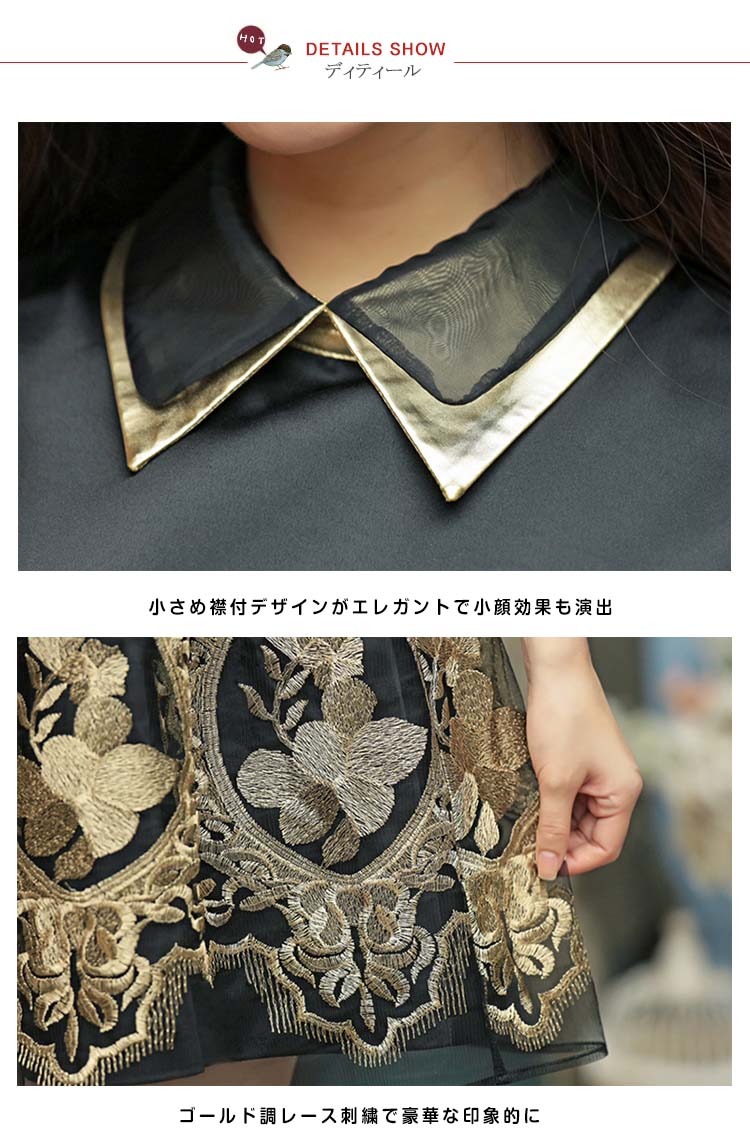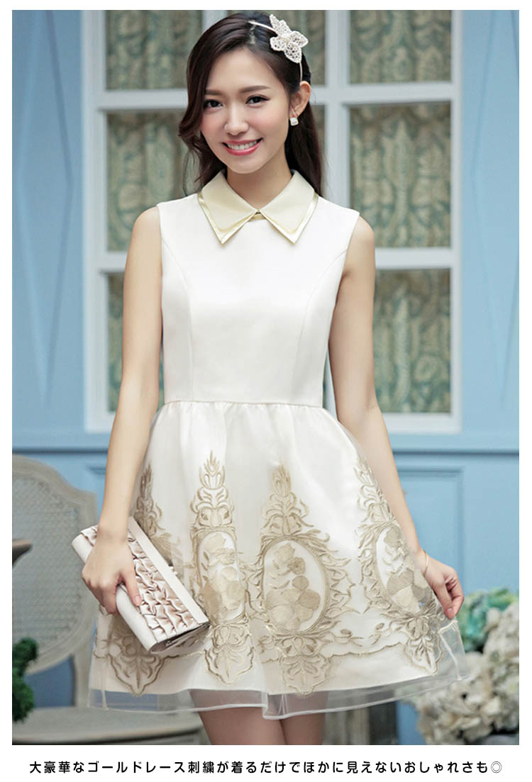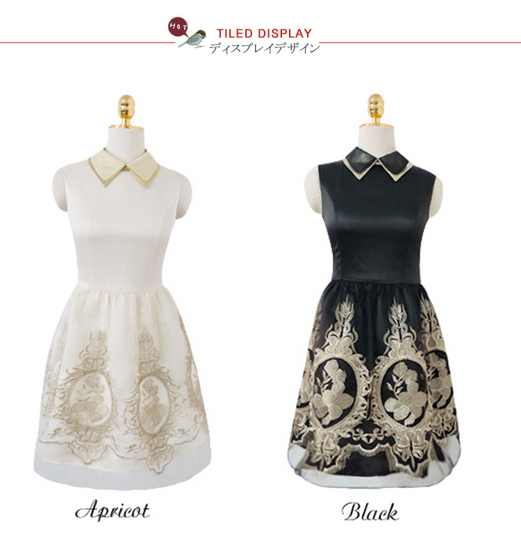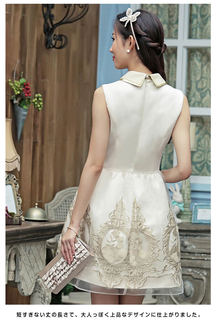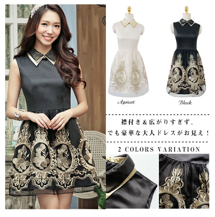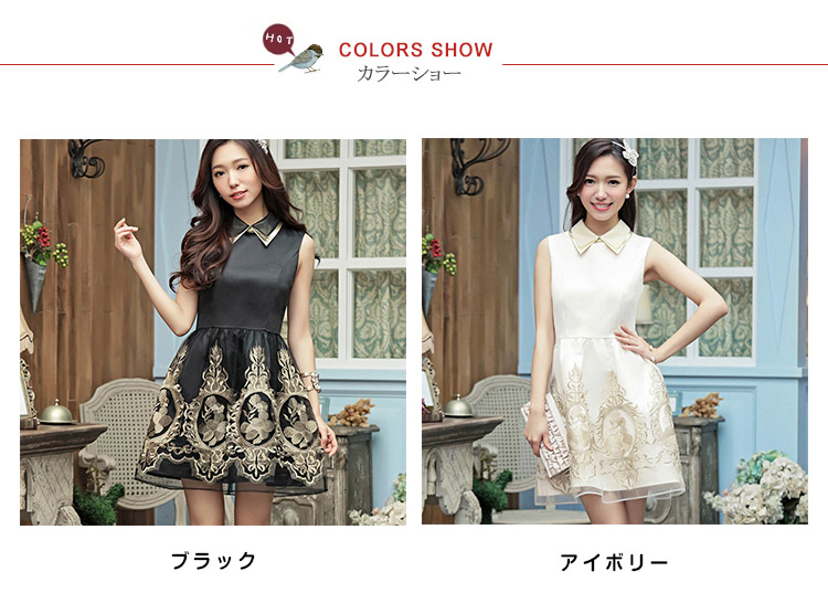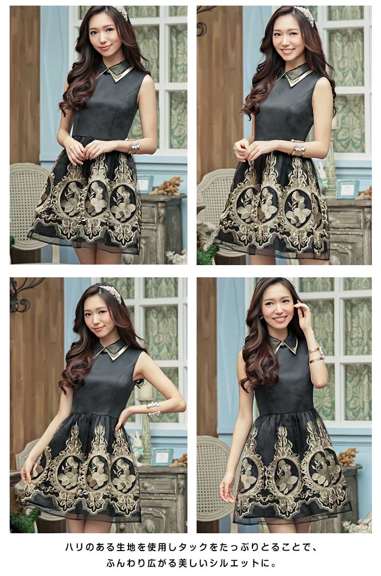 | 襟付き&広がりすぎず、でも豪華な大人ドレスがお見え!ハリのある生地を使用しタックをたっぷりとることで、ふんわり広がる美しいシルエットに。大豪華なゴールドレース刺繍が着るだけでほかに見えないおしゃれさも◎短すぎない丈の長さで、大人っぽく上品なデザインに仕上がりました。ちょっとしたお出掛けや通勤やパーティーなど、特別な日の一着として重宝しそう☆ | |