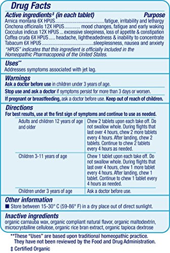 -. Title : Genexa Jet Lag Homeopathic Relief: Certified Organic, Physician Formulated, Natural, Non-GMO, Jet Lag Flight Fatigue Remedy. Helps You Feel Less Fatigued & Fresher After Arrival (60 Chewable Pills)