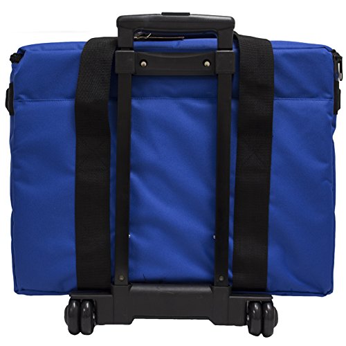 The Louva 19” Rolling Sewing Machine Trolley in Cobalt blue features rugged ball bearing extended height wheel set and a telescoping, lockable comfort grip handle for easy maneuverability.