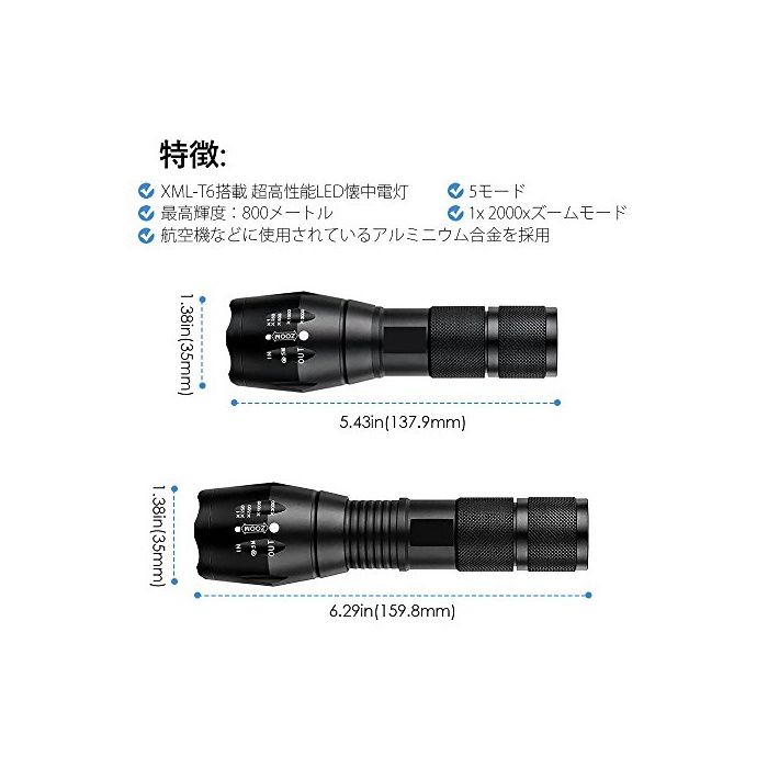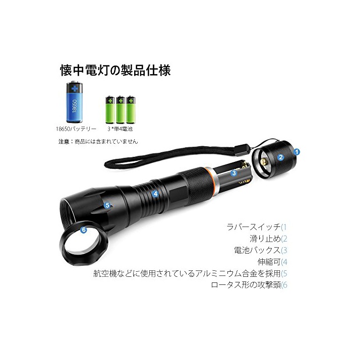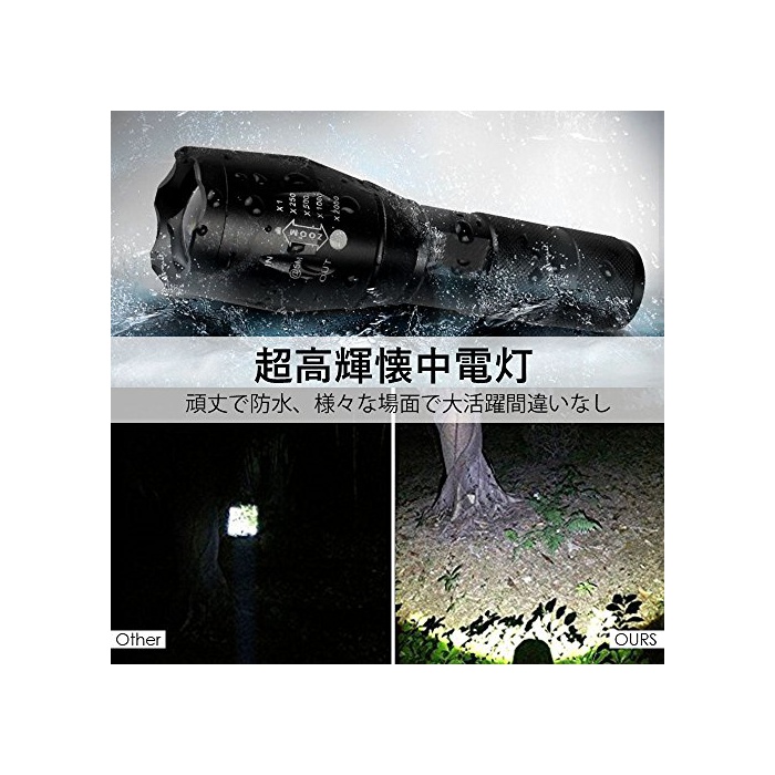 원본상품명: YUANZE 高輝度LED中電 5つのモド ズムフォカス機能付 防水 防災 アウトドア 夜間ウォキング 2個/セットブラック 電池格 1本18650電池/4電池3本(電池は含まれており