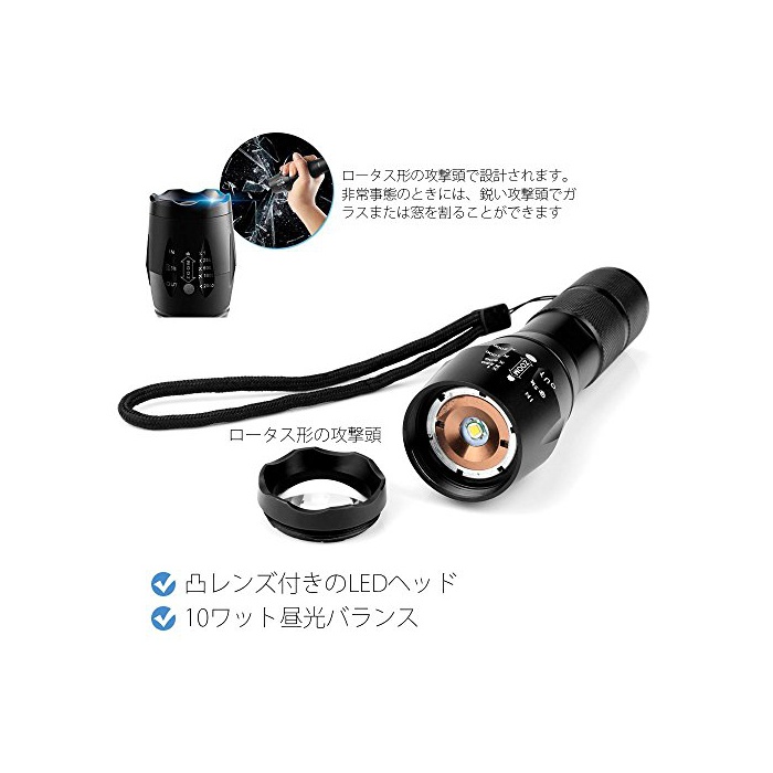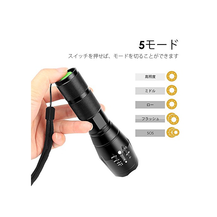 5개의 모드 줌 포커스 기능:단부의 전원 스위치를 누르면,아키라→어둠→점멸을 바뀝니다밝기를 자유롭게 조정한다.또한헤드 부분을 회전 시키는 한 조사 범위를 넓히거나,좁히거나 하는 것 를 할 수 있습니다.좋은 줌 포커스 기능이 어느(있는),각종의 장면에 의해 대응에서 옵니다!