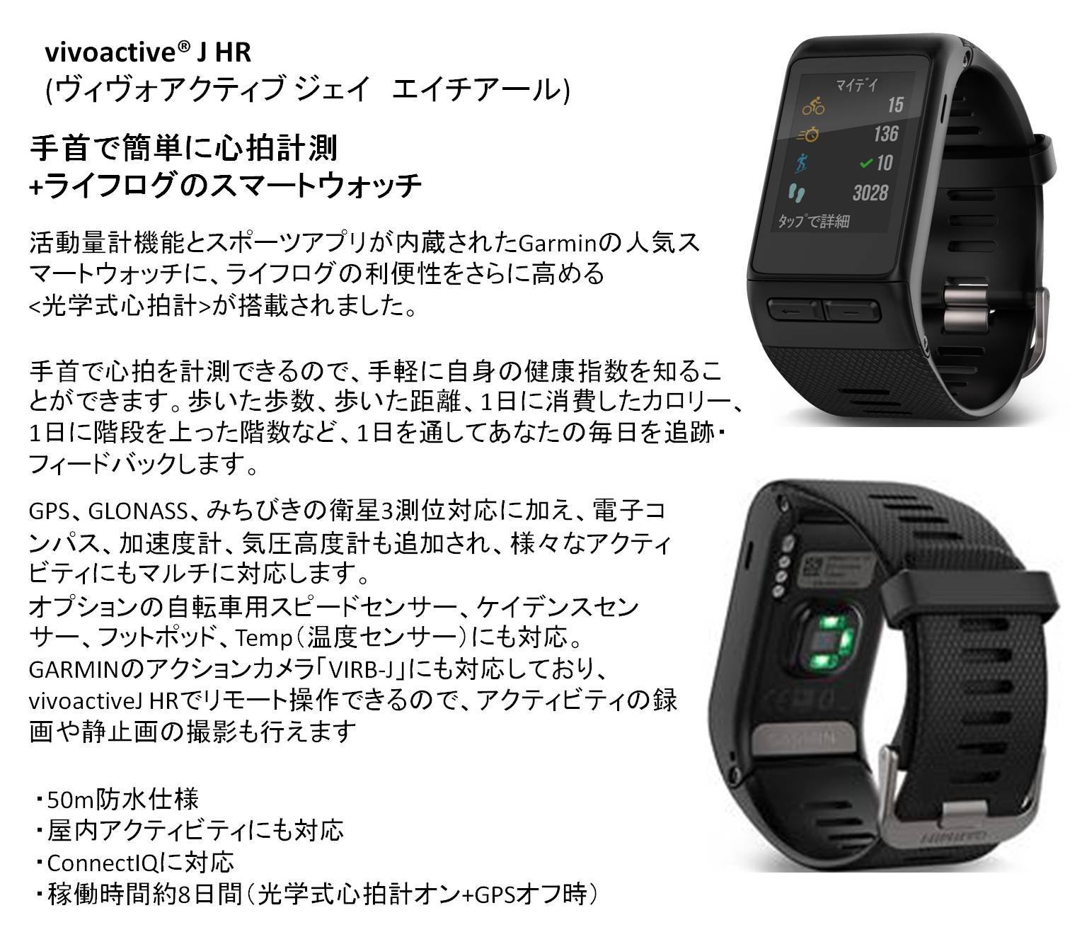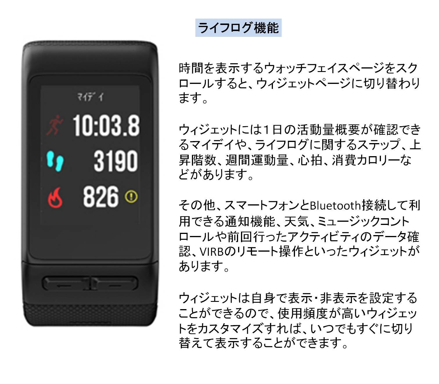 Battery operation time is up to 8 days in watch / life log mode, maximum 13 hours when using GPS