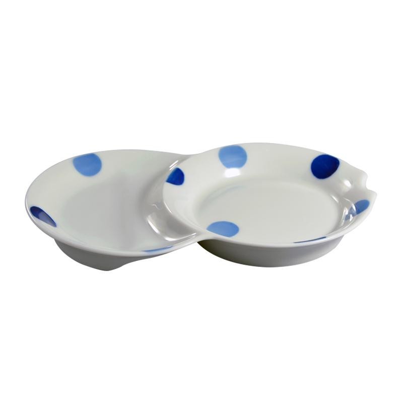 | 二種類のお料理やソースなどを盛ることができる、便利なお皿です。片方の皿はななめになっているので、お皿の傾斜を利用して、余分な醤油などを切ることができます。また、お皿のフチの一部が丸く欠けて、箸置きになっています。 |