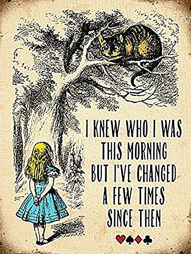 Alice in Wonderland "I knew who I was this Morning" Cheshire Cat Vintage Style Metal Wall Plaque Sign 8" x 6" (og)