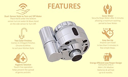 Smart Touchless Kitchen & Bath Sink Faucet Adapter. Reduce Water Consumption with Automatic Dual Motion Sensors to Turn Water On & Off. DIY Easy To Install & Fits Most Standard Faucets ( Chrome )