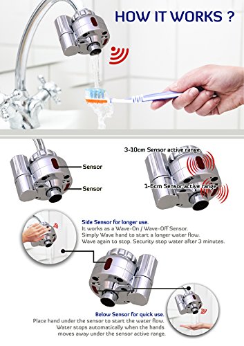 ✔ WATER SAVER - This Elegant piece of Design is introduced specially to save water . The Two sensors one on the bottom and one on the side act as controllers to the water flow. When your hands are under the bottom sensor the water flow automatically starts and when your hands are off the sensor range the water stops. The sensor on the side act as a wave-on or wave-off sensor. When you wave your hand on the side the water flow starts and when you wave again the water stops.