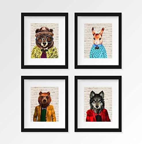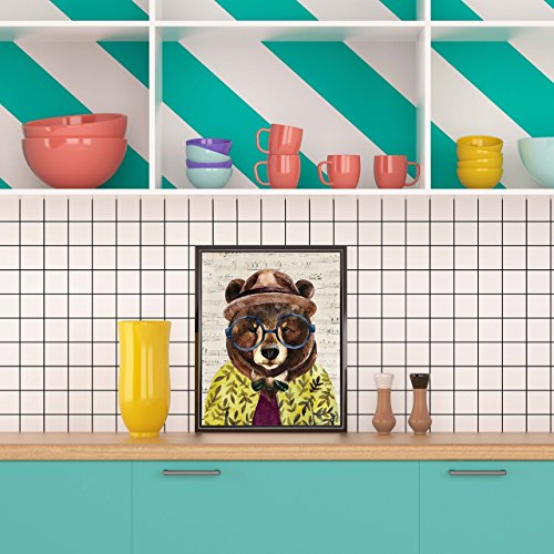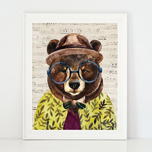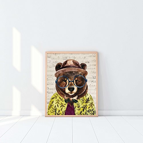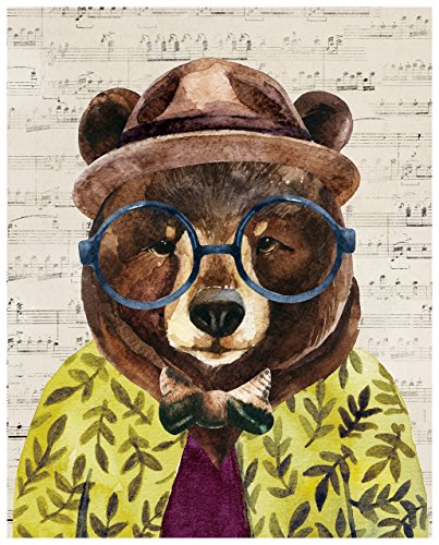 This quirky and playful home interiors art print is of a geeky bear in a hat, shirt and tie on a printed background of old musical paper.